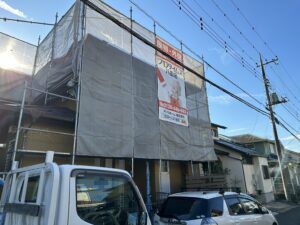 足場組み立ても終わり、塗装工事前の下地調整をしています‼️