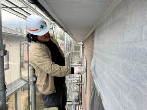 軒天を塗ってから壁下塗りを塗布するので、こーへい君のあとを追って行くのは、壁担当の『ヨッシー君です😊』